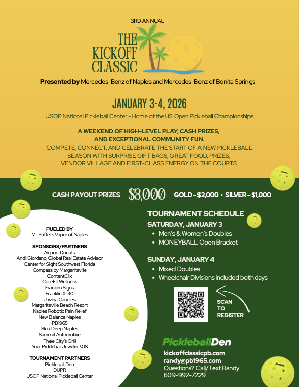 The USOP National Pickleball Center provides a full range of private and semi-private lessons, skill and drill sessions, open play, and has a state of the art 2,000 square foot pro shop with pickleball equipment and apparel located in East Naples, which is also home of the Minto US Open Pickleball Championships held annually in the spring attracting an additional 50,000 visitors from all 50 states and dozens of countries.