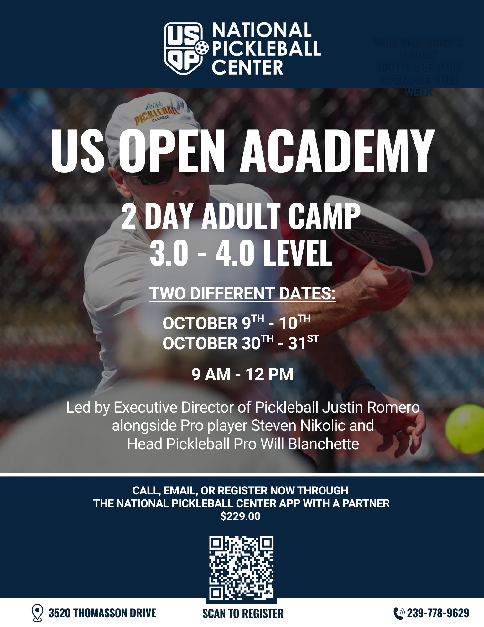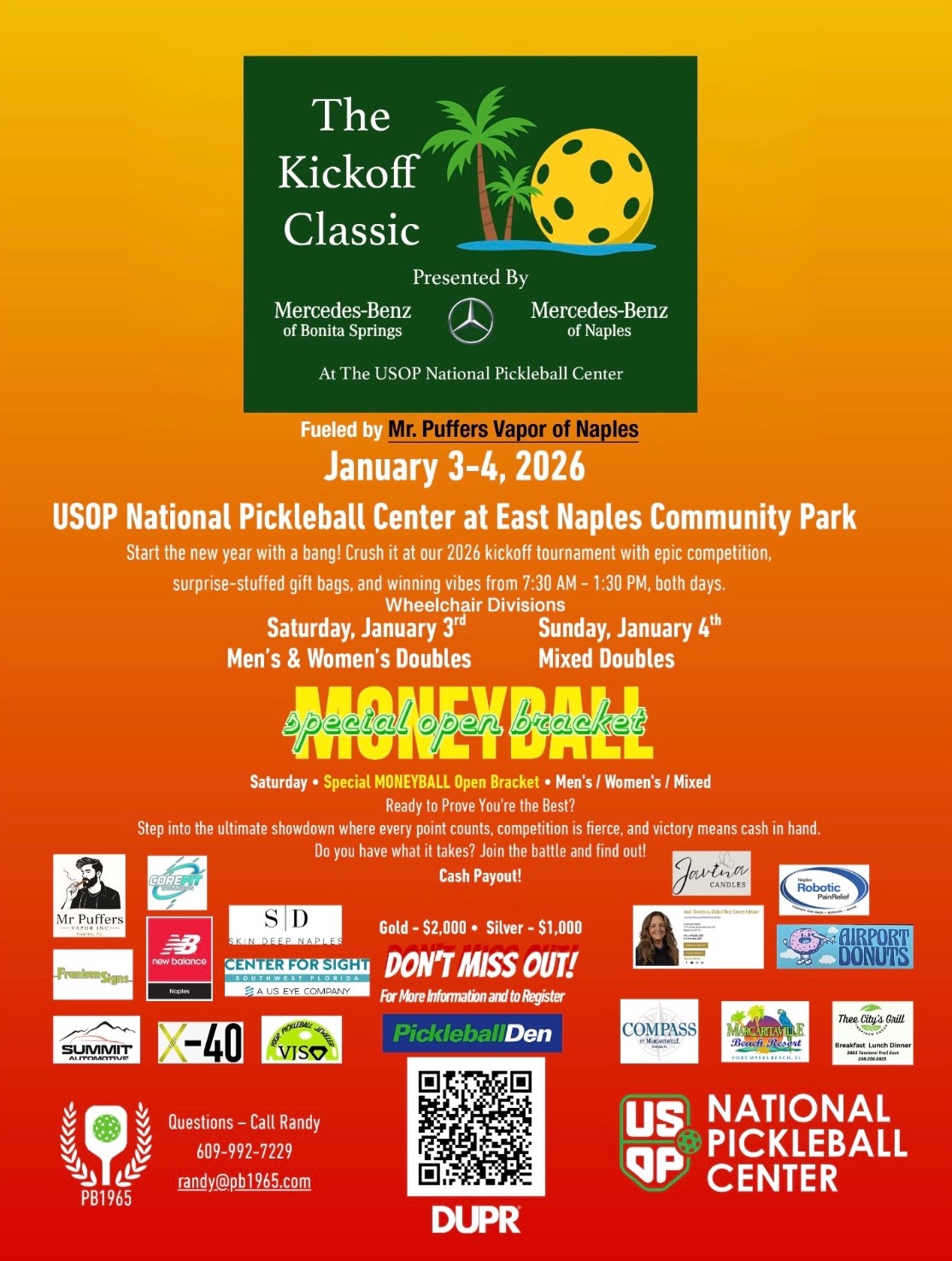 The USOP National Pickleball Center provides a full range of private and semi-private lessons, skill and drill sessions, open play, and has a state of the art 2,000 square foot pro shop with pickleball equipment and apparel located in East Naples, which is also home of the Minto US Open Pickleball Championships held annually in the spring attracting an additional 50,000 visitors from all 50 states and dozens of countries.