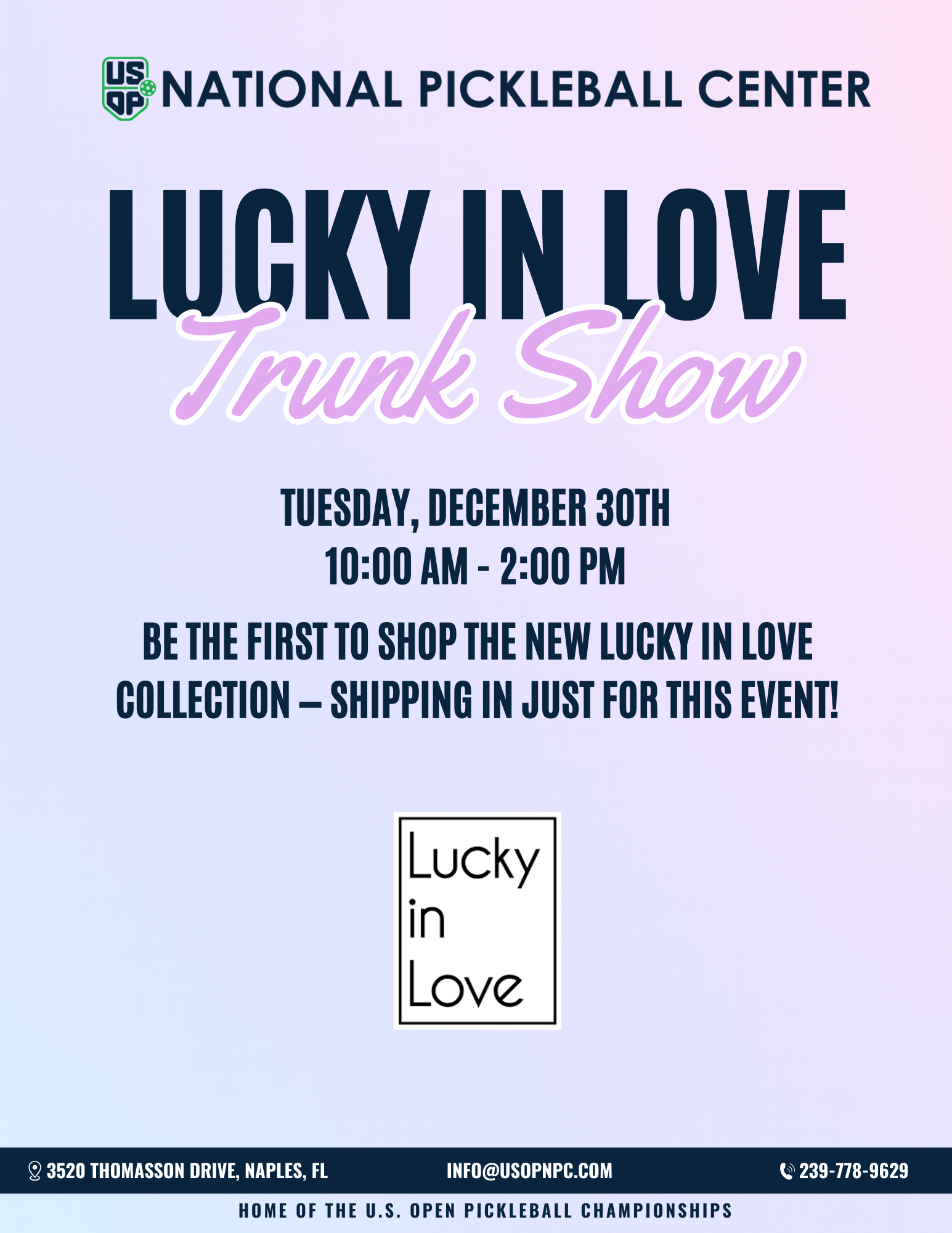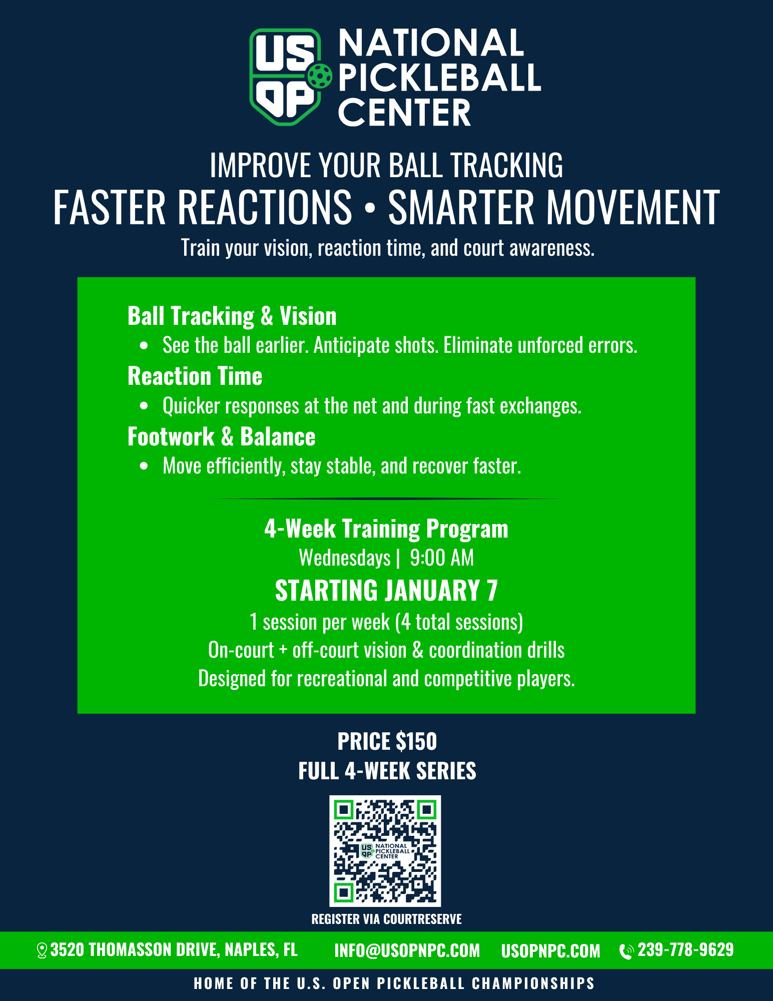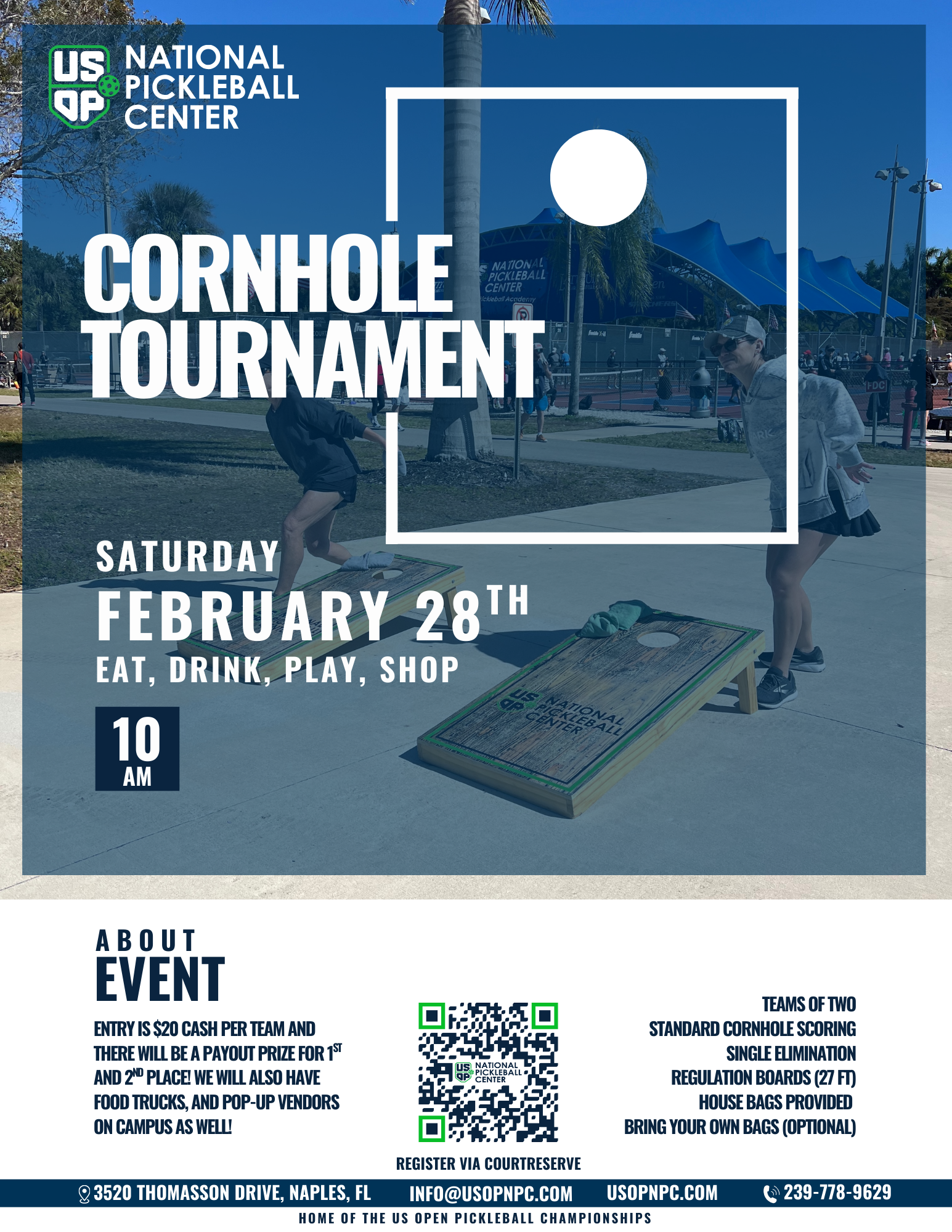 The USOP National Pickleball Center provides a full range of private and semi-private lessons, skill and drill sessions, open play, and has a state of the art 2,000 square foot pro shop with pickleball equipment and apparel located in East Naples, which is also home of the US Open Pickleball Championships held annually in the spring attracting an additional 50,000 visitors from all 50 states and dozens of countries.